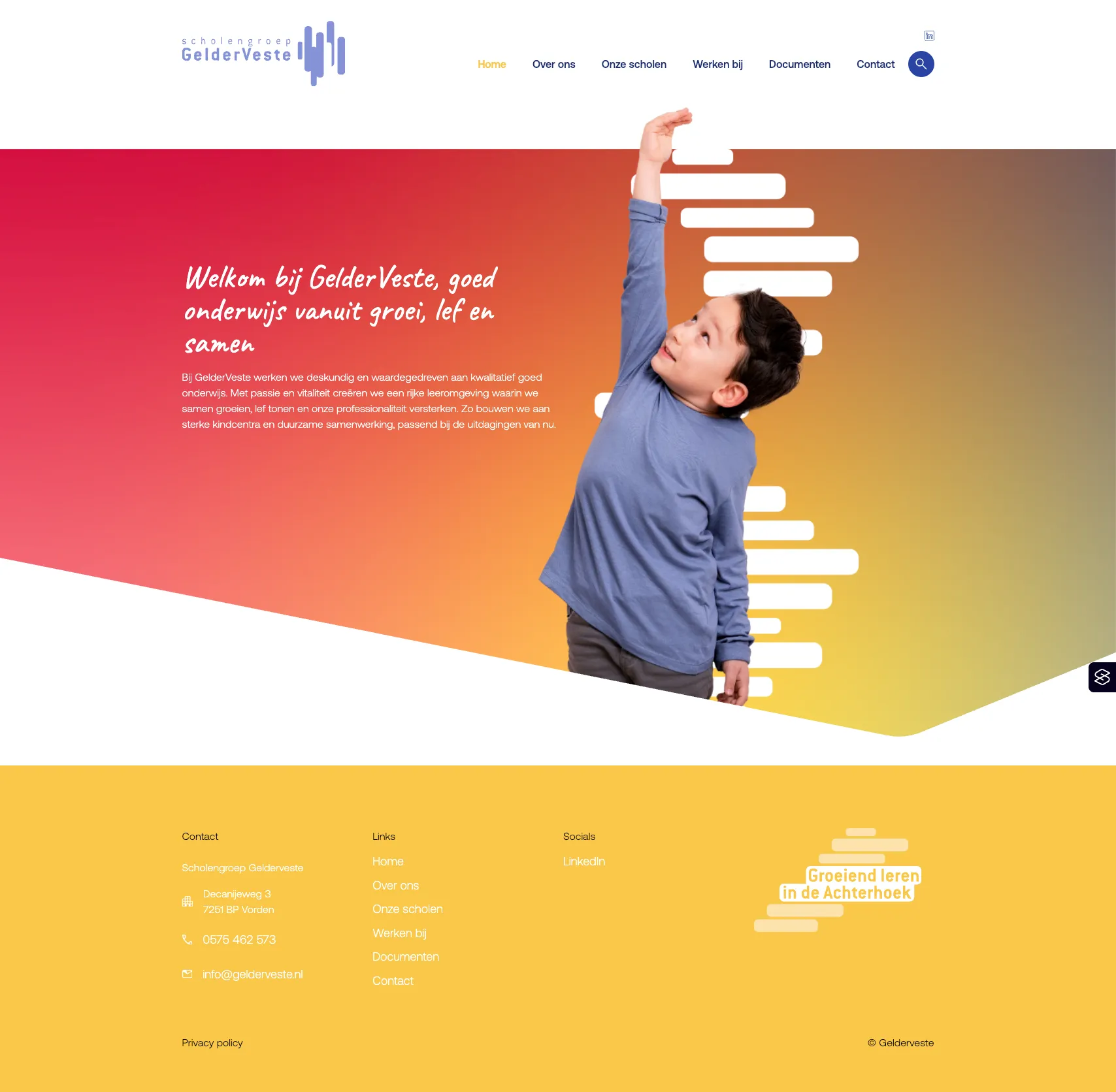 Bij GelderVeste werken we deskundig en waardegedreven aan kwalitatief goed onderwijs. Met passie en vitaliteit creëren we een rijke leeromgeving waarin we samen groeien, lef tonen en onze professionaliteit versterken. Zo bouwen we aan sterke kindcentra en duurzame samenwerking, passend bij de uitdagingen van nu.